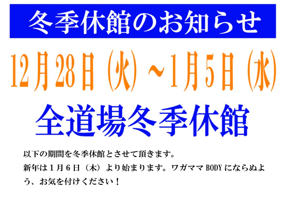 ほう/れん/そう 年末年始 冬季休館のお知らせ by photouser 2021年11月18日 written by photouser 2021年11月18日 12月28日~2022年1月5日までを冬季休館とさせて頂きます。 本年も実家からは「帰ってこなくとも良い」と指令を受けております(‘◇’)ゞ 皆様は如何でしょうか。 以下の期間、全道場が休館となります。 年初には、いよいよ昇段審査会を開催します! お正月気分も良いですが、生煮えにならないようご自愛下さい! 子供教室戸田道場朝霞道場極真空手武蔵浦和道場 0 comment previous post 第7回FORCE大会 主催・MMA道場鷹様に出場! next post 12月度の日曜日クラスについて 関連記事はこちら ドリームフェスティバル選抜 群馬県大会にて 20251013 2025年10月13日 忍杯 全関東大会にて 20250928 2025年10月3日 JKJO王者決定戦2025にて 20250921 2025年9月24日 9月15日(月)、GENKI CHALLENGEにて 20250914 2025年9月24日 拳チャレ大会 結果 20250907 2025年10月3日 リアル選抜大会にて 20250831 2025年10月3日 JKJO東京大会にて 20250823 2025年8月24日 拳チャレ大会 詳報を 20250821 2025年8月21日 全極真 東日本大会にて 20250811 2025年8月14日 第1回東京都空手道選手権大会(武将杯全日本&チャンピオンカップ選抜)にて 20250810 2025年8月14日 Leave a Comment Cancel Replyコメントを投稿するにはログインしてください。