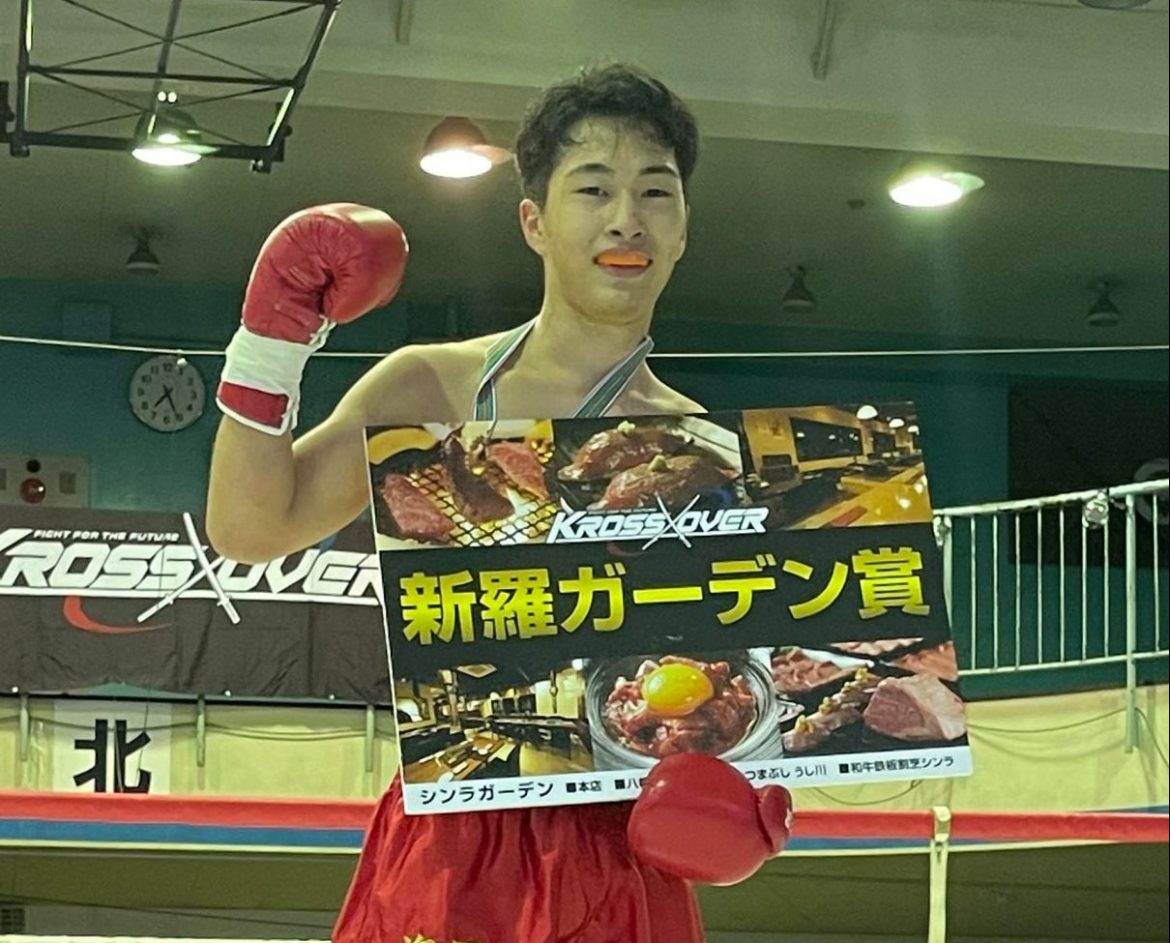右フックを起点に、左ストレートがクリーンヒット。ぐらつく相手を見て、果敢に攻め込むも倒しきれない。